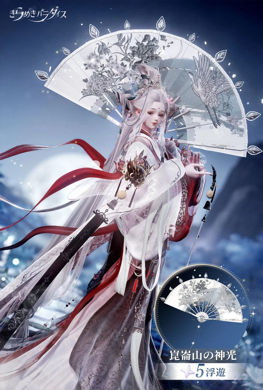 静寂に包まれた深い森の中で、千年の灯火を越えても揺らぐことのない純粋さを表現した星5セット『鈴夢の音』。野山の精霊をテーマに、無形文化遺産である「滾灯」技術や高山植物の要素が取り入れられた、温かく幻想的な衣装です。
